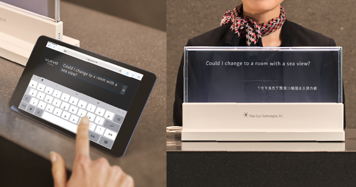 VUEVO Display(ビューボ ディスプレイ)は、リアルタイムで会話内容の字幕・翻訳を、透明なディスプレイの両面に表示します。