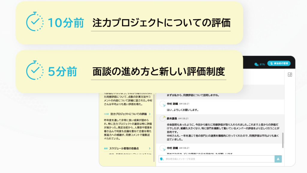 会話の内容は5分ごとに AI がリアルタイムに要約を生成します。これにより、参加者間の意識を合わせ、本来の会議の目的やゴールを目指しやすくなります。