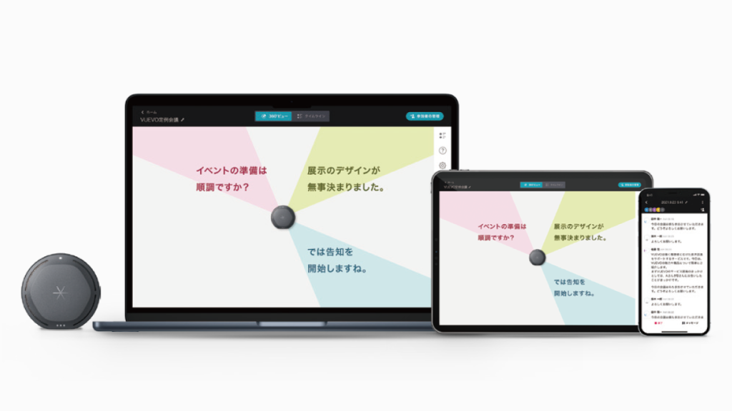 スマートフォンやタブレットに加えて、オフィスワークでは欠かせないPCにも対応。VUEVO(ビューボ)マイク専用のスマートフォンアプリとウェブアプリをシーンに合わせてご利用いただけます。
