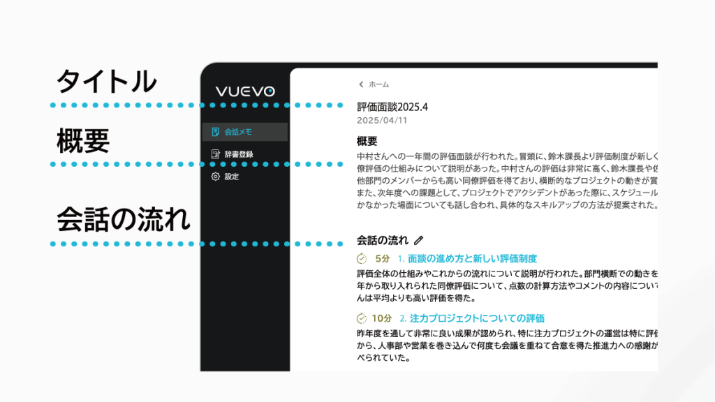 会議終了後は会議記録から「タイトル」「概要」「会話の流れ」を AI が自動生成します。会議の内容を手動でまとめる手間が省け、他の重要な業務に集中できます。