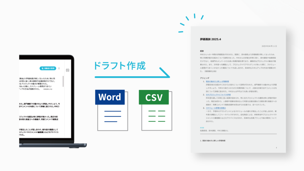 会話記録はWordやCSVファイルにダウンロード可能。議事録や報告書の「テキスト素材」として活用することで、業務時間を短縮し、生産効率を向上します。